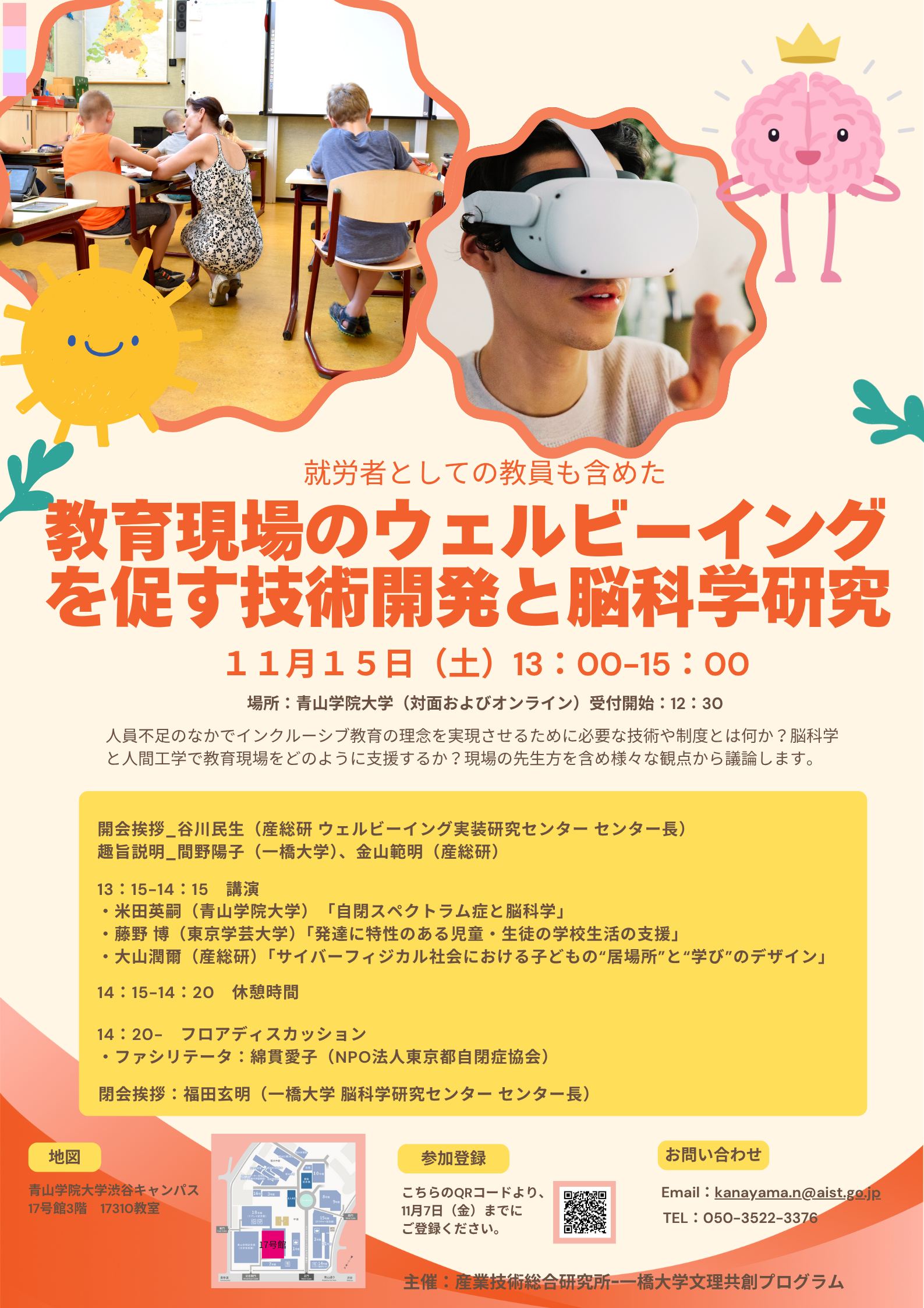 11/15(土)産業技術総合研究所-一橋大学文理共創プログラム『就労者としての教員も含めた教育現場のウェルビーイングを促す技術開発と脳科学研究』