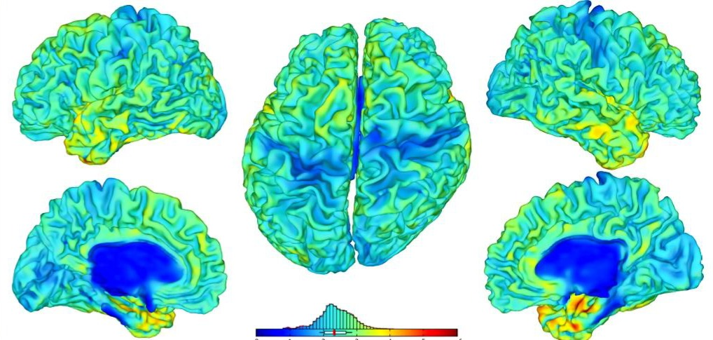 下の図は、脳内の情報処理を担っている皮質の厚みを表しています。左右の側頭部が特に発達していることが見てとれます。